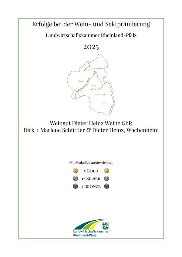 Die Kammerpreismünze der Landesprämierung in Gold, Silber oder Bronze ist das Markenzeichen prämierter Winzer in Rheinland-Pfalz. Urkunden bezeugen die erfolgreiche Teilnahme am größten regionalen Qualitätswettbewerb für Wein und Sekt und schmücken die Wände von Probierstuben und Verkaufsräumen.